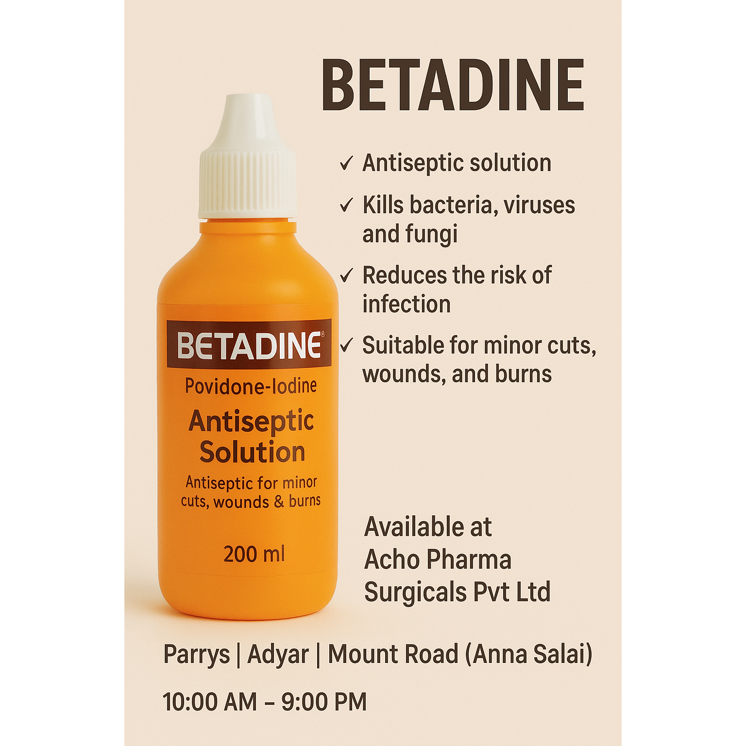 ๐งด Betadine Antiseptic Solution in Chennai โ Available at Acho Pharma Surgicals Pvt Ltd Looking for Betadine Antiseptic Solution in Chennai? Visit Acho Pharma Surgicals Pvt Ltd, your trusted medical and surgical supplier with branches in Parrys, Adyar & Mount Road (Anna Salai). โ Effective Antiseptic for Wound Care & Minor Cuts โ Helps Prevent Infection in Burns, Cuts & Abrasions โ Trusted Hospital-Grade Formula โ Easy-to-Use Liquid Solution โ Available in Multiple Pack Sizes Why Buy from Acho Pharma Surgicals? โ๏ธ 100% Genuine & Trusted Brands โ๏ธ Competitive Prices โ๏ธ Available for Hospitals, Clinics & Home Use โ๏ธ Same-Day Delivery Across Chennai ๐ Branches: Parrys | Adyar | Mount Road (Anna Salai) ๐ Timings: 10:00 AM โ 9:00 PM ๐ Same-Day Delivery Available in Chennai