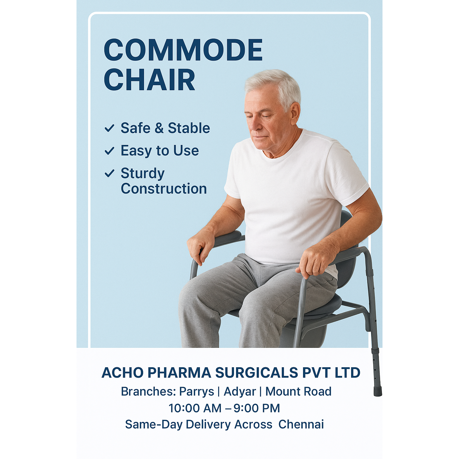 🪑 Commode Chair in Chennai – Available at Acho Pharma Surgicals Pvt Ltd Looking for a reliable and comfortable Commode Chair in Chennai? Get it at Acho Pharma Surgicals Pvt Ltd, your trusted medical and surgical store with branches in Parrys, Adyar & Mount Road (Anna Salai). ✅ Strong & Durable Frame ✅ Foldable & Portable Options Available ✅ Comfortable Seat with Easy Cleaning ✅ Ideal for Elderly, Patients & Mobility Support ✅ Available in Multiple Models (Fixed, Folding, Wheelchair Commode) Why Choose Us? ✔️ Genuine & High-Quality Medical Products ✔️ Affordable & Competitive Prices ✔️ Suitable for Hospitals, Nursing Homes & Home Care ✔️ Same-Day Delivery Across Chennai 📍 Branches: Parrys | Adyar | Mount Road (Anna Salai) 🕙 Timings: 10:00 AM – 9:00 PM 🚚 Same-Day Delivery Available