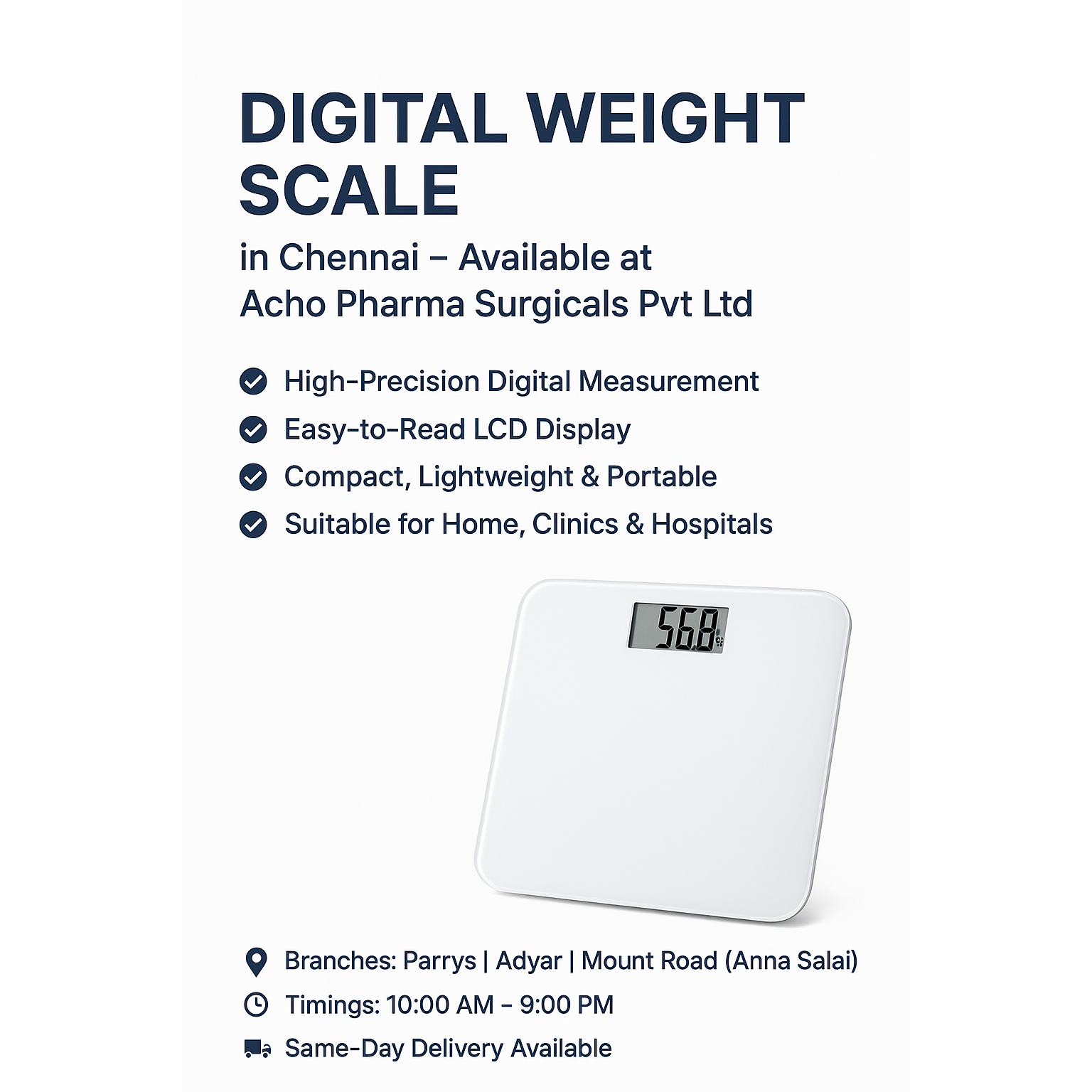 Digital Weight Scale in Chennai – Available at Acho Pharma Surgicals Pvt Ltd Looking for a Digital Weight Scale in Chennai? Visit Acho Pharma Surgicals Pvt Ltd, your trusted surgical and medical supplier with branches in Parrys, Adyar & Mount Road (Anna Salai). ✅ Accurate & High-Precision Digital Measurement ✅ Easy-to-Read LCD Display ✅ Compact, Lightweight & Portable ✅ Durable Design – Perfect for Home, Clinics & Hospitals ✅ Available in Multiple Models & Sizes Why Choose Acho Pharma Surgicals? ✔️ Genuine Medical & Personal Care Products ✔️ Affordable Pricing ✔️ Trusted by Hospitals & Home Users ✔️ Same-Day Delivery in Chennai 📍 Branches: Parrys | Adyar | Mount Road (Anna Salai) 🕙 Timings: 10:00 AM – 9:00 PM 🚚 Same-Day Delivery Available