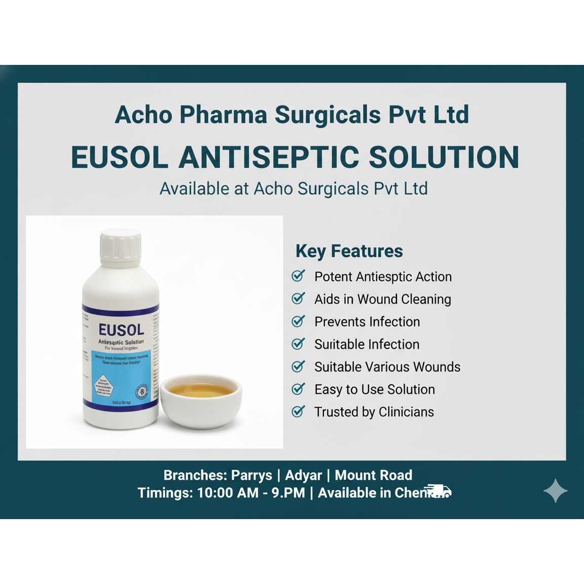 ๐งด Eusol Antiseptic Solution in Chennai โ Available at Acho Pharma Surgicals Pvt Ltd Looking for Eusol Antiseptic Solution in Chennai? Find it at Acho Pharma Surgicals Pvt Ltd, your trusted surgical and medical supplies store with branches in Parrys, Adyar & Mount Road (Anna Salai). โ Effective Antiseptic for Wound Cleaning & Dressing โ Helps Prevent Infection in Cuts, Ulcers & Burns โ Suitable for Hospital & Home Medical Use โ Clear Solution with Strong Germicidal Action โ Recommended by Healthcare Professionals Why Choose Us? โ๏ธ 100% Genuine & Fresh Medical Solutions โ๏ธ Affordable Pricing & Bulk Supply Options โ๏ธ Trusted by Hospitals, Clinics & Home Users โ๏ธ Same-Day Delivery Across Chennai ๐ Branches: Parrys | Adyar | Mount Road (Anna Salai) ๐ Timings: 10:00 AM โ 9:00 PM ๐ Same-Day Delivery Available