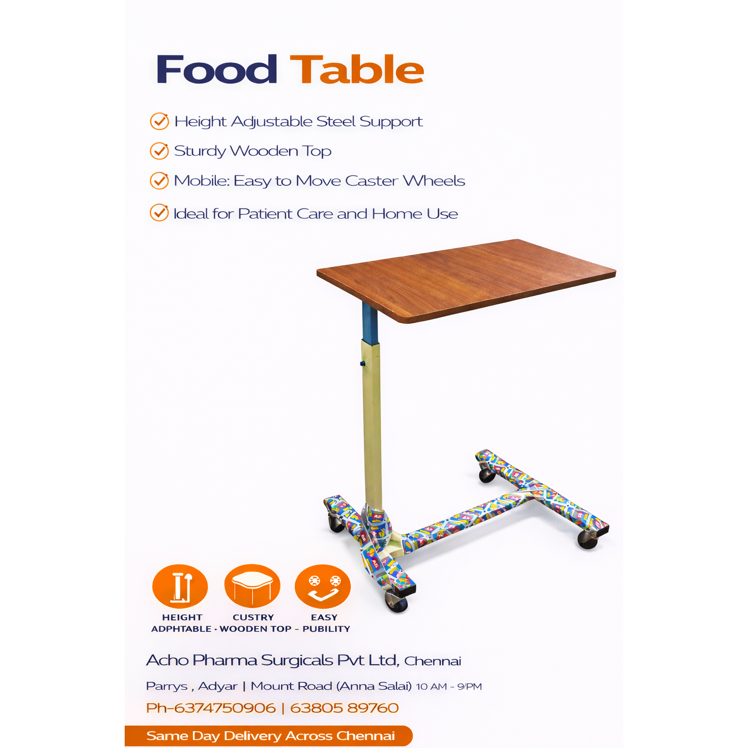 Patient Food Table with Height Adjustable – Available in Chennai Patient Food Table (Height Adjustable) available at Acho Pharma Surgicals Pvt Ltd – convenient bedside table designed for patients to eat, read, or use essentials comfortably while in bed. 🔹 Key Features: Height adjustable mechanism for easy positioning Strong metal frame with durable tabletop Smooth movement wheels for easy mobility Lockable wheels for stability Easy to clean laminated surface Ideal for hospitals, home care & patient recovery Suitable for hospital beds & home beds Best quality at Best Rate 📍 Available at: Acho Pharma Surgicals Pvt Ltd 📌 Triplicane & Adyar – Chennai 📞 Call / WhatsApp: 6374750906 | 6380589740 🚚 Home Delivery Available 📍 Areas We Serve: Chennai | Mount Road | Anna Salai | Triplicane | Triplicane High Road | Triplicane South | Royapettah | Royapettah High Road | Mylapore | Santhome | RA Puram | Raja Annamalai Puram | Teynampet | Alwarpet | Nungambakkam | Thousand Lights | Egmore | Kilpauk | Purasawalkam | Parrys | Broadway | George Town | Mannadi | Sowcarpet | Washermanpet | Royapuram | Tondiarpet | Tiruvottiyur | Perambur | Kolathur | Anna Nagar | Villivakkam | Ambattur | Avadi | Arumbakkam | Koyambedu | Vadapalani | Porur | Poonamallee | Adyar | Besant Nagar | Thiruvanmiyur | Velachery | Guindy | OMR | ECR | Tambaram | Pallavaram | Chromepet | Near Me | Home Delivery | Tamil Nadu