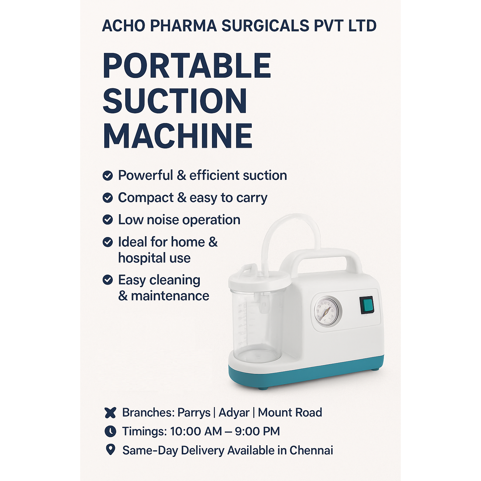 Portable Suction Machine in Chennai – Available at Acho Pharma Surgicals Pvt Ltd Looking for a Portable Suction Machine in Chennai? Visit Acho Pharma Surgicals Pvt Ltd, your trusted medical and surgical store with branches in Parrys, Adyar & Mount Road (Anna Salai). Our suction machines are designed for safe, efficient, and reliable airway clearance in home care and hospital settings. ✅ Powerful & efficient suction ✅ Compact, lightweight & easy to carry ✅ Low noise operation for patient comfort ✅ Easy to clean & maintain ✅ Suitable for home, clinics & hospitals Why Choose Acho Pharma Surgicals? ✔️ 100% Genuine Medical Equipment ✔️ Affordable Price & High Reliability ✔️ Same-Day Delivery Across Chennai 📍 Branches: Parrys | Adyar | Mount Road 🕙 Timings: 10:00 AM – 9:00 PM 🚚 Same-Day Delivery Available in Chennai