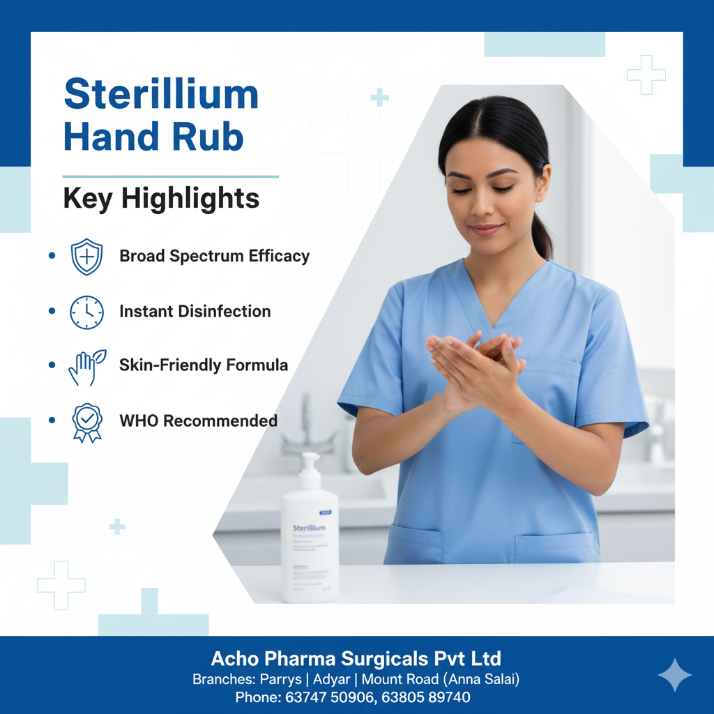 ๐งด Sterilium Hand Rub โ Hospital-Grade Hand Disinfectant Available at Acho Pharma Surgicals, Chennai โ Product Description Sterilium Hand Rub is a high-quality alcohol-based hand disinfectant widely used in hospitals, clinics, laboratories, and home healthcare. It provides rapid and effective antimicrobial protection, killing bacteria, viruses, and fungi within seconds. โจ Key Features ๐น Fast-Acting Formula Eliminates germs quickly with 60โ70% alcohol composition (brand-specific). ๐น Broad-Spectrum Protection Effective against bacteria, enveloped viruses, and common pathogens. ๐น Skin-Friendly & Non-Sticky Contains skin conditioners that prevent dryness even with repeated use. ๐น No Water Required Ideal for situations where soap and water are not available. ๐น Quick Drying Leaves hands clean, fresh, and residue-free. ๐น Preferred in Hospitals Widely used in ICUs, OPDs, nursing stations, and home-care setups. ๐ฆ Available Packs (Depending on stock availability) 100 ml 500 ml 1 Liter ๐ Ideal For Hospitals & Clinics Home & office use Nursing care Travel & on-the-go hygiene Doctors, nurses & healthcare workers