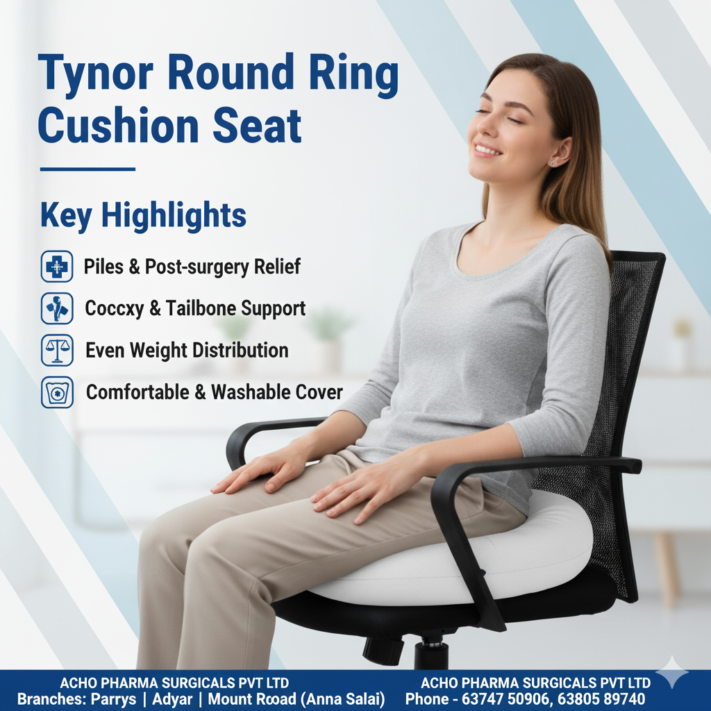 Tynor Round Ring Cushion Seat in Chennai – Available at Acho Pharma Surgicals The Tynor Round Ring Cushion Seat is designed to provide pressure relief and superior comfort for individuals suffering from piles, tailbone pain, fissures, postpartum discomfort, and prolonged sitting pain. Its ergonomic ring shape helps reduce pressure on sensitive areas while ensuring a natural sitting posture. ✅ Product Features High-density foam for long-lasting comfort Ergonomic ring design to relieve pressure Soft, breathable, washable cover Helps reduce pain from piles, fissures & coccyx injuries Ideal for office chairs, home seating & travel Lightweight and easy to carry ⭐ Best For Piles / Hemorrhoids Tailbone (coccyx) pain Fissures Post-surgery recovery Pregnancy & postpartum comfort Long sitting hours (office, car, travel) 🔍 SEO Keywords Tynor round ring cushion seat Chennai Piles seat cushion Chennai Coccyx pain cushion Hemorrhoid ring cushion Fissure seat pillow Ortho ring cushion Chennai Acho Pharma Surgicals orthopedic support 📍 Available At: Acho Pharma Surgicals Pvt Ltd 5/3, Quaide Millath Road, Triplicane, Chennai – 600005 (Opp. Adam Market Bus Stop, Near Mount Road) 🕙 Timing: 10 AM – 9 PM Serving: Mount Road | Triplicane | Egmore | Royapettah | Chepauk | Omandurar Hospital | Greams Road | Thiruvanmaur | Besant Nagar | Adyar.