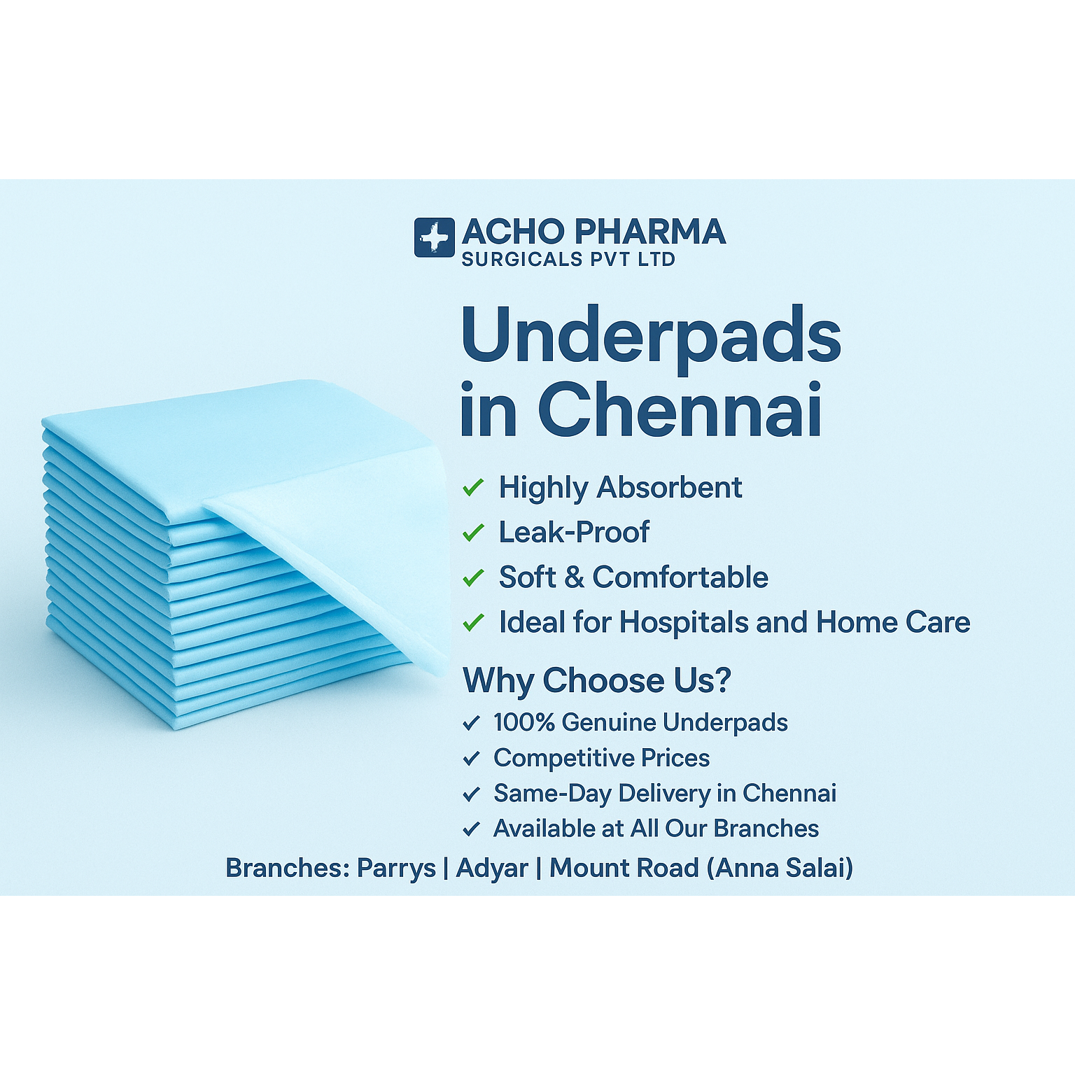 Underpads – Disposable Bed Pads for Hygiene & Comfort | Chennai Searching for Underpads in Chennai? Acho Pharma Surgicals offers high-quality, super-absorbent disposable underpads ideal for bedridden patients, elderly care, post-surgery recovery, and incontinence management. ✅ Key Features ✔️ Super absorbent core ✔️ Leak-proof PE backing ✔️ Soft, non-woven top layer ✔️ Comfortable for sensitive skin ✔️ Keeps bed, chair & wheelchair dry ✔️ Available in multiple sizes (60×90, 60×60, etc.) ✔️ Disposable & hygienic ⭐ Best For Bedridden patients Elderly adults Incontinence care Baby diaper-changing mats Post-surgery patients Hospital & home care 🔍 SEO Keywords underpads Chennai, disposable bed pads, adult underpads, diaper changing pads, absorbent bed sheets, incontinent bed protector, medical underpads near me. 📍 Available At: Acho Pharma Surgicals Pvt Ltd 5/3, Quaide Millath Road, Triplicane, Chennai – 600005 (Opp. Adam Market Bus Stop, Near Mount Road) 🕙 Timing: 10 AM – 9 PM Serving: Mount Road | Triplicane | Egmore | Royapettah | Chepauk | Omandurar Hospital | Greams Road | Thiruvanmaiyur | Besant Nagar | Adyar.